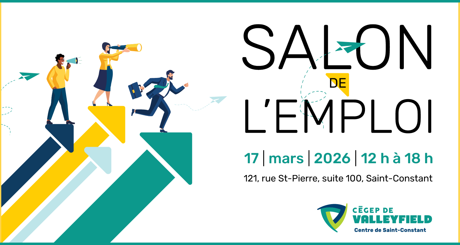 Nous sommes heureux de vous inviter à notre tout premier Salon de l’emploi! Cet événement, ouvert aux étudiant(e)s du centre ainsi qu’à la population de Saint-Constant et des environs, permettra à toute personne désireuse de se trouver un emploi dans divers secteurs de discuter avec des représentant(e)s d’entreprises de la région.