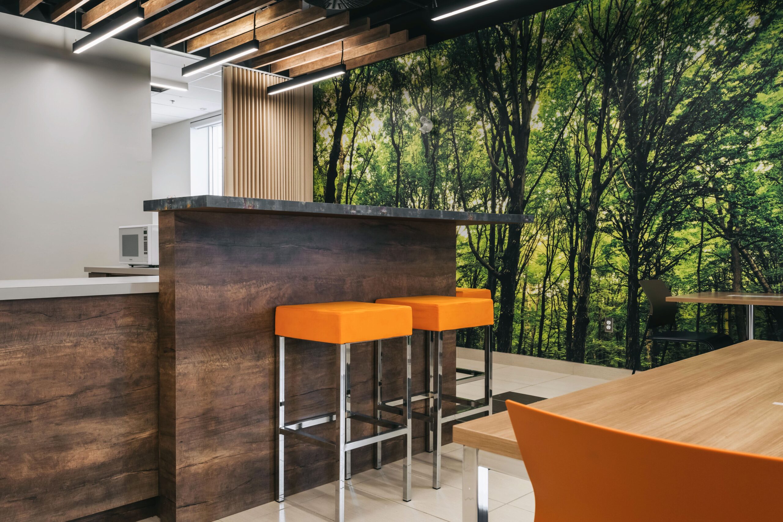 Il est possible de vous assoir pour manger ou travailler dans les aires communes et espaces dîneurs. Des micro-ondes sont mis à votre disposition pour réchauffer votre repas. Il y a aussi plusieurs options de restauration à distance de marche.